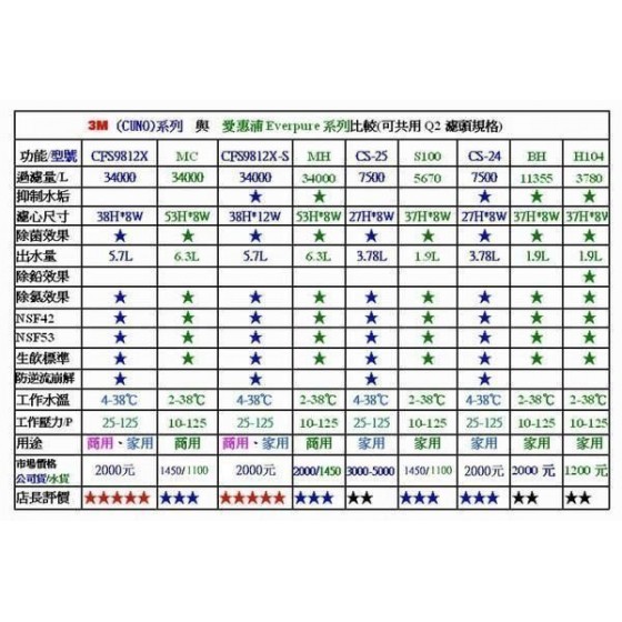5. 以所有條件分析下來以3M的CFS9812X、CFS9812X-S這二個型號給的評價最高的,主因在此二款的過濾流量壽命長、出水量大、體積小,一般的家庭廚俱下方容易安裝,而Everpure的同功能的MC規格長度過長無法安裝於廚俱下方。