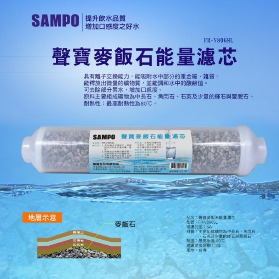 第五道濾心:聲寶麥飯石能量濾心,型FR V806SL《建議一年更換》,最高耐溫80°C,材質: 100%天然麥飯石,增加口感度。產地:台灣