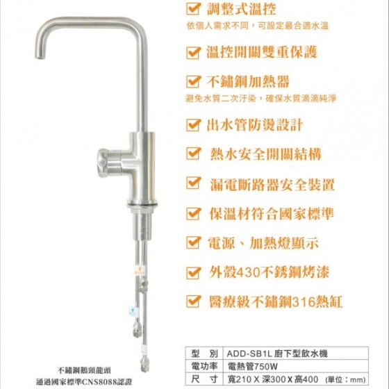 ADD廚下型加熱器飲水機-無壓式SB1L (免運含安裝)