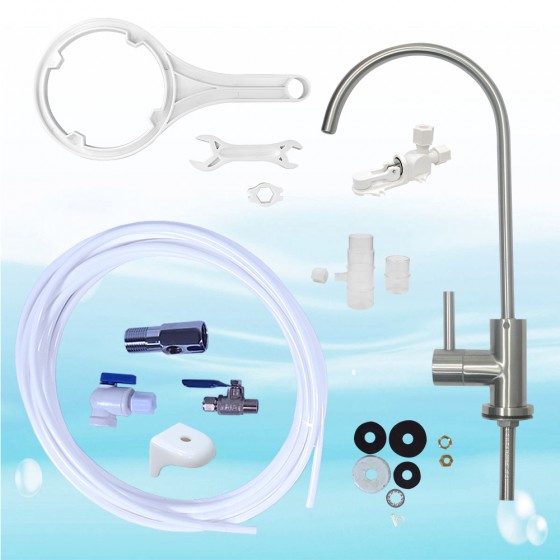 6米PE水管、進水三通、2分考克、儲水桶閥門、ADD台製不銹鋼美式鵝頸龍頭(無鉛設計) 、鵝頸龍頭吊片、濾殼把手、說明書、廢水三通、漏水保護器 (2分規格)