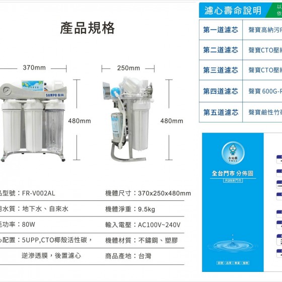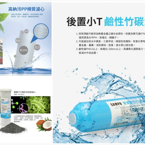 聲寶 免壓力桶 值輸機 家用RO機 使用600G RO膜 達到瞬間大流量出水 0.0001微米過濾 售價含安裝 16000元 保固量年 含不鏽鋼龍頭/漏水保護器 第一管使用 聲寶 高納污PP棉 *1 有效攔截大顆粒汙染物 建議壽命6個月 (通用規格) 第二管使用 聲寶 壓縮塊狀CTO 有效除水中氯氣、異味 建議壽命6個月 (通用規格) 第三管使用 聲寶 壓縮塊狀CTO 有效除水中氯氣、異味 建議壽命12個月 (通用規格) 第四管使用 聲寶 600G RO膜 有效去除水中雜質、細菌、重金屬等 建議壽命3~5年 (可換其他品牌 3012大胖膜殼) 弟五管使用 聲寶 小T鹼性竹炭 調整口感,提高水中PH值、使用鎂合金增加水中 鎂離子 建議壽命12個月 (通用規格) (以上配置建議使用於自來水地區、與一搬家廷用水量一日用水量20公升以下)