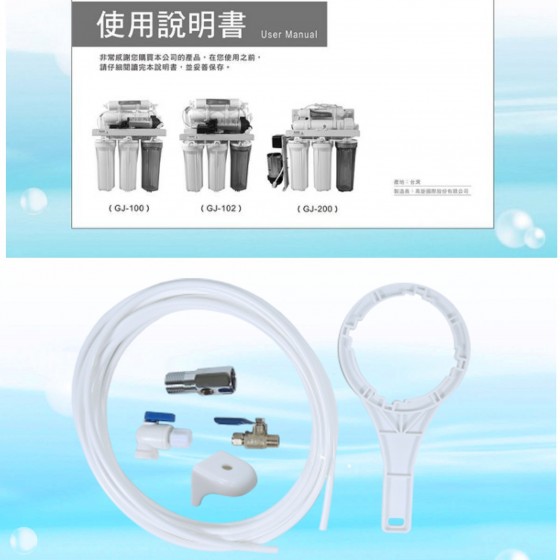 6米PE水管、進水三通、2分考克、儲水桶閥門、聲寶美式大勾管陶瓷鵝頸龍頭(無鉛設計) 、鵝頸龍頭吊片、濾殼扳手組、廢水三通、說明書